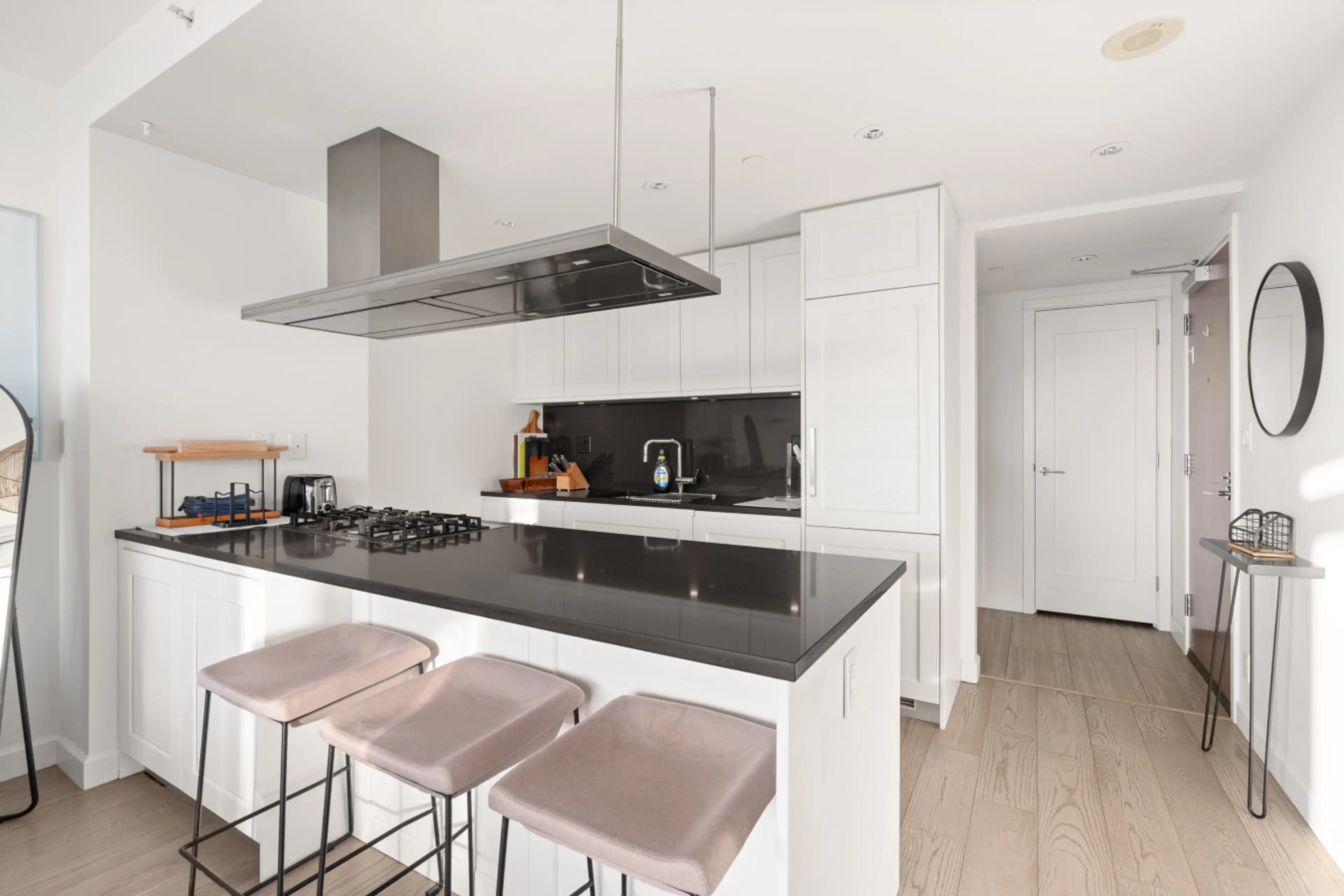 Bright 21st-floor 1-bedroom apartment with sweeping ocean and city views through floor-to-ceiling windows. This well-appointed 661 sq ft home features an open living space, modern kitchen with island seating, dedicated workspace, and private balcony. Enjoy natural light throughout, in-unit laundry, ...